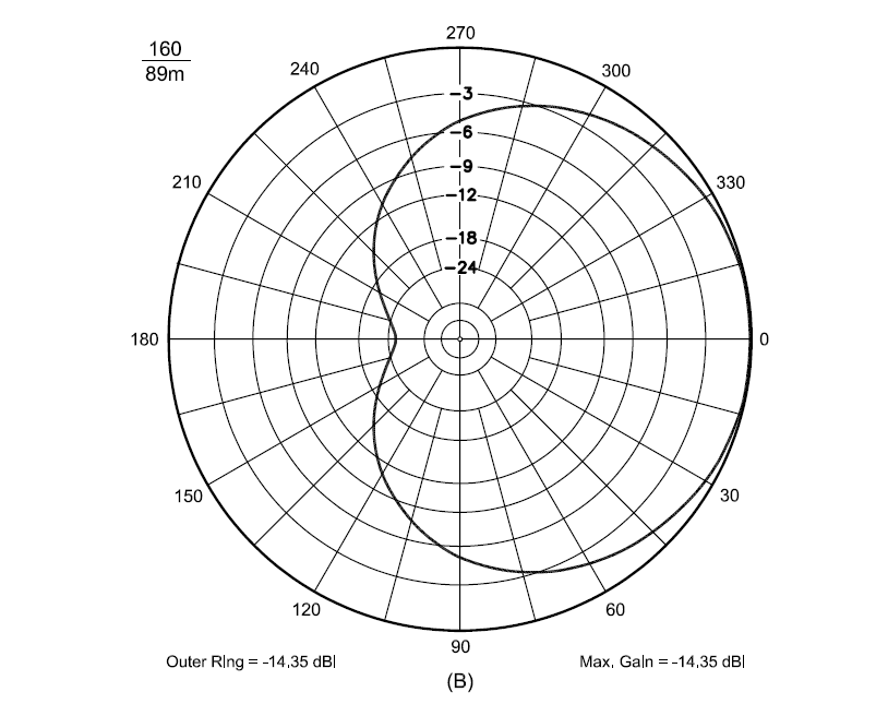 Interestingly, the BOG does not have an obvious peak in its performance relative to the Inverted-L in its “preferred” direction of 230-250 degrees pointing along its axis and directed away from its feedpoint. Of course, a 500 ft BOG would not be expected to have much directivity at 630M, for its wavelength assuming a velocity factor of 55% would be only (500/0.55 * 12/39.37)/630 = 277/630 = 0.44 wavelengths. So it would be even less directional than the elevated 89m-long 160M (0.56 wavelength) Beverage in this illustration taken from ON4UN’s text where the -3 dB points are at approximately +/- 70 degrees: