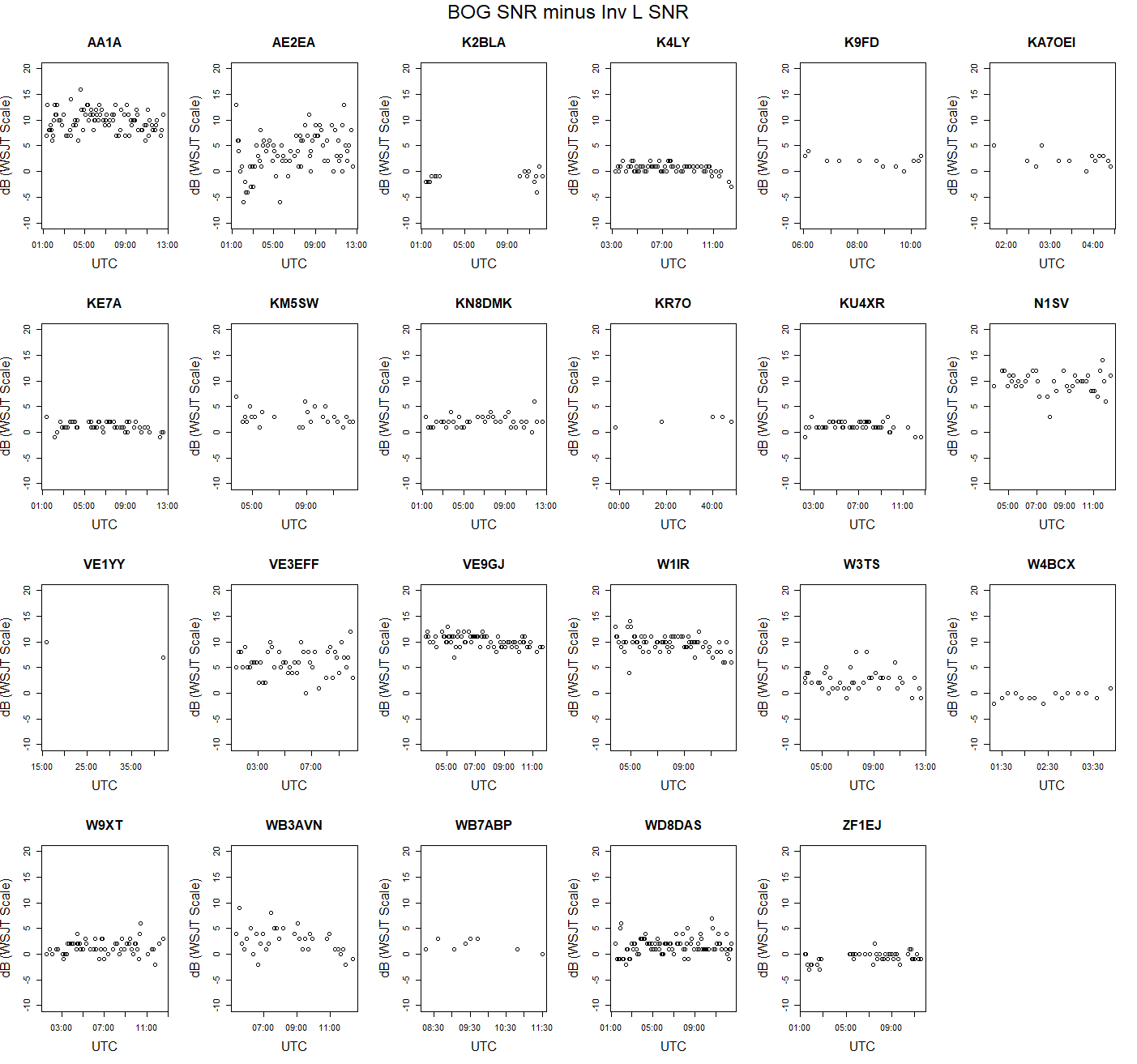 To sort this out, I thought that it might be helpful to look at the difference in signal strengths between the two antennas for each callsign/azimuth received as a function of time, so I produced the graph below. It shows a small graph of (BOG SNR minus Inverted-L SNR) vs time for each simultaneous reception for each callsign received. In other words, it plots the difference in dB of the SNR for signals simultaneously received by both antennas vs time for each individual station received. I set this up so that the X axis will autoscale for each individual graph to give the best display of datapoints for that particular station. As a result, the X axes differ from graph to graph, so stay alert as you peruse this image. If the image is too small for you to view it comfortably, you may find it helpful to right-click on the image and then open it in a separate tab so that you can enlarge it to better see the details. A few of the graphs (e.g. KR7O, VE1YY) where the station was only received over a very short interval show minutes instead of hours on the X axis: