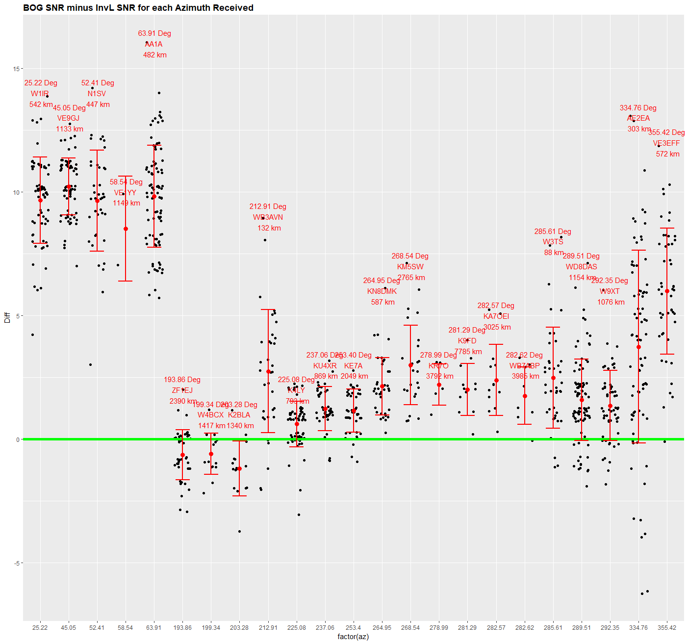 The graphs below will show signal strength (or difference in signal strength) in WSJT units (dB) on the Y axis, and either callsign or azimuth on the X axis. For each X value all data points for that X value will be shown, along with the mean and standard deviation error bars for those values. In addition, to make interpretation easier, the Azimuth, Callsign, and Distance to the received station from FN20ag (W3SZ location) will be shown in red near the upper error bar. Where that text data is not given on the graphs of signal strength vs azimuth, the omission is because two or more stations shared a single azimuth value. A horizontal green line will mark the 0 dB signal level on each graph.