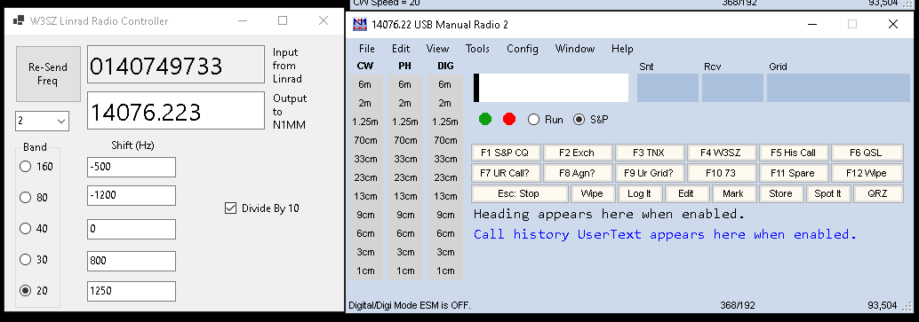 After downloading the zip file for the C# app that runs on your N1MM computer you need to unzip it and then run the setup.exe file that it contains. As you can see in the image at the top of this page, the C# app allows you to set offsets for 5 bands, which were chosen to match the bands covered by SM5BSZ's excellent WSE hardware. You need to manually select the offset that you want to apply, using the radiobuttons to the left of the shift text boxes.